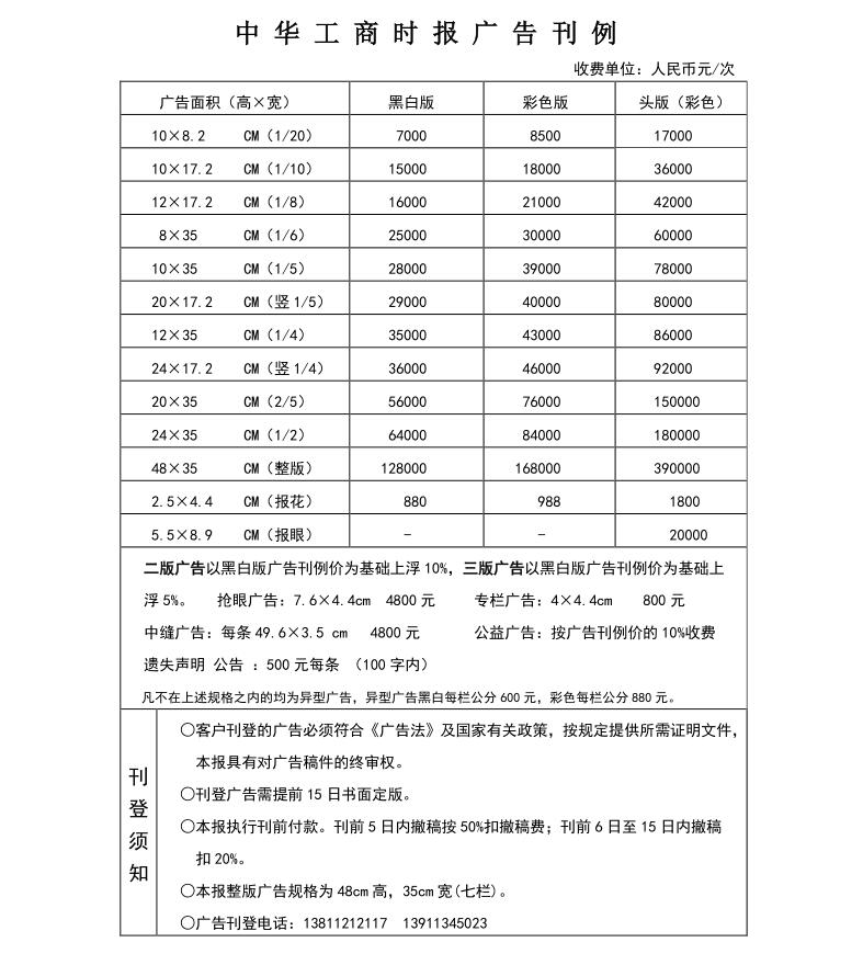 中华工商时报登报广告价格 最新报价 广告刊例,中华工商时报是以财经报道为主要内容的全国性综合经济类日报。由中华全国工商业联合会、中国民间商会主办,向海内外发行。中华工商时报国内刊号:CN11-0168 中华工商时报国外发行代号:1-146 中华工商时报以广大工商界人士以及所有关心中国改革与发展的海内外读者为服务对象。